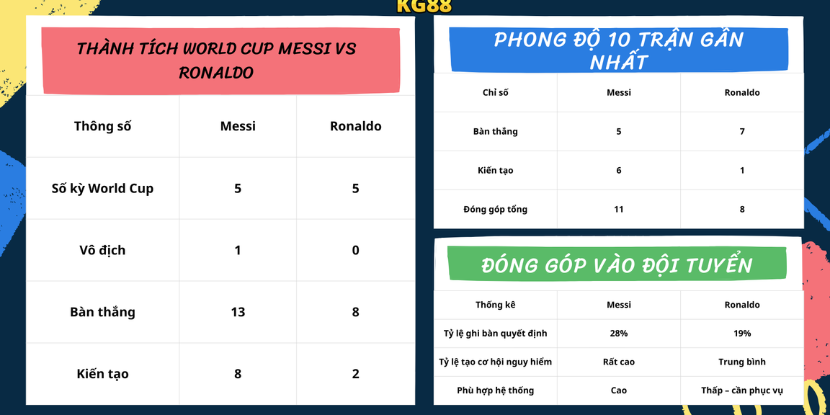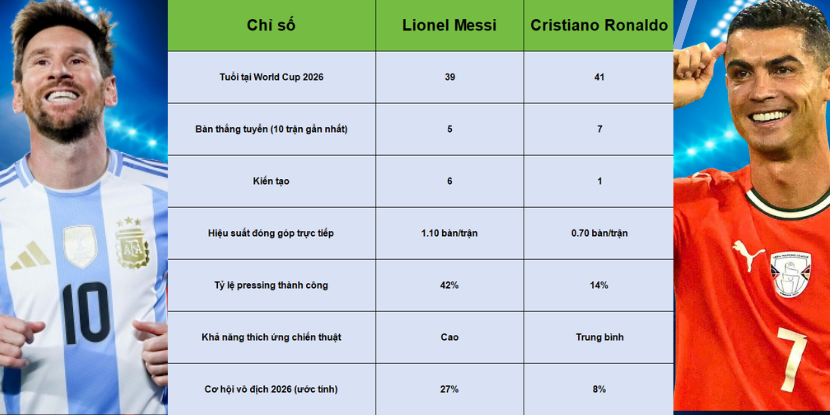 Dựa trên dữ liệu phong độ, phân tích chiến thuật và mô hình xác suất, nhận định của Messi về việc Ronaldo khó vô địch World Cup 2026 là hoàn toàn có cơ sở. Argentina duy trì cấu trúc ổn định, trong khi Bồ Đào Nha phải đánh đổi chiến thuật khi Ronaldo ra sân. Dù CR7 vẫn có khả năng tạo dấu ấn cá nhân, cơ hội để anh nâng cao cúp thế giới thực tế rất thấp. Cuộc cạnh tranh giữa hai huyền thoại bước vào giai đoạn cuối, nhưng lợi thế đang nghiêng về phía Messi.