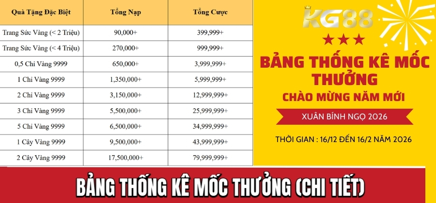 Ghi chú: Bảng trên lấy nguyên liệu từ thông báo chương trình do KG88 cung cấp. Các mốc biểu thị ngưỡng tối thiểu để đủ điều kiện nhận quà tương ứng.